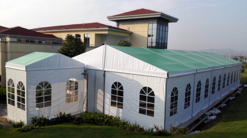 篷房主體框架為高強(qiáng)度特制鋁合金結(jié)構(gòu),重量輕,永不生銹;連接部位為采用國際焊接技術(shù)鋼結(jié)構(gòu),可調(diào)節(jié)式基座可彌補(bǔ)場地的不平,篷房采用進(jìn)口雙層PVC刀刮篷布,該篷布抗拉伸,抗撕裂,抗寒耐高溫,防火B(yǎng)1級(jí),采用高頻焊接技術(shù),篷房抗風(fēng)能力達(dá)到80-100公里/小時(shí)。