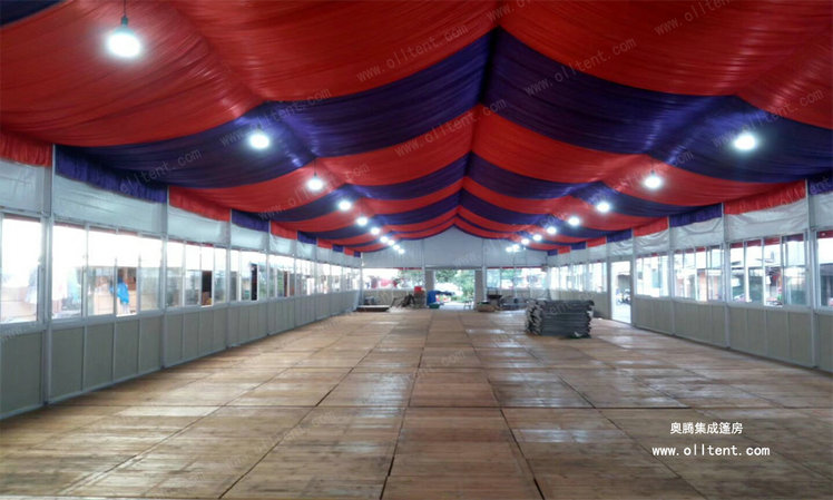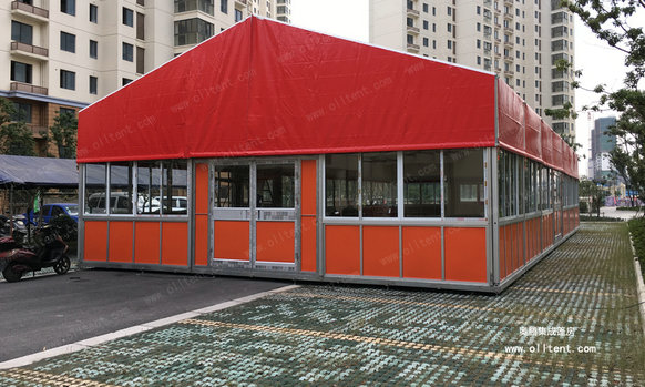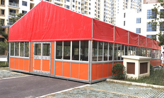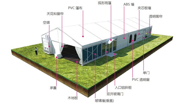 CQ系列小型篷房常規(guī)寬度是6米、9米、12米、15米共四種常用尺寸。篷檐高度(邊高)是3米。篷房的結(jié)構(gòu)采用單元組合式設(shè)計,長度可按3米間距增加或減少。支架的主要構(gòu)件(立柱和斜梁)用四槽的122×68×3㎜四槽的高強(qiáng)度氧化鋁合金管材制造,篷布采用阻燃的雙面PVC刀刮布,符合歐洲DIN4102B1M2標(biāo)準(zhǔn)。克重650750850/平方米,有遮光和半透光兩種篷布選擇,篷房同樣可以配套ABS墻體、三明治墻體、彩鋼瓦墻體、玻璃幕墻、排水槽等豐富的配置,滿足各種功能需要。