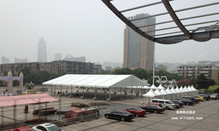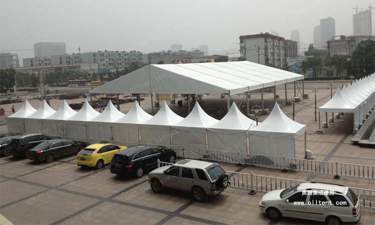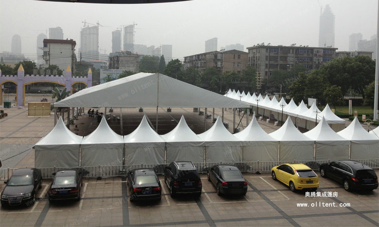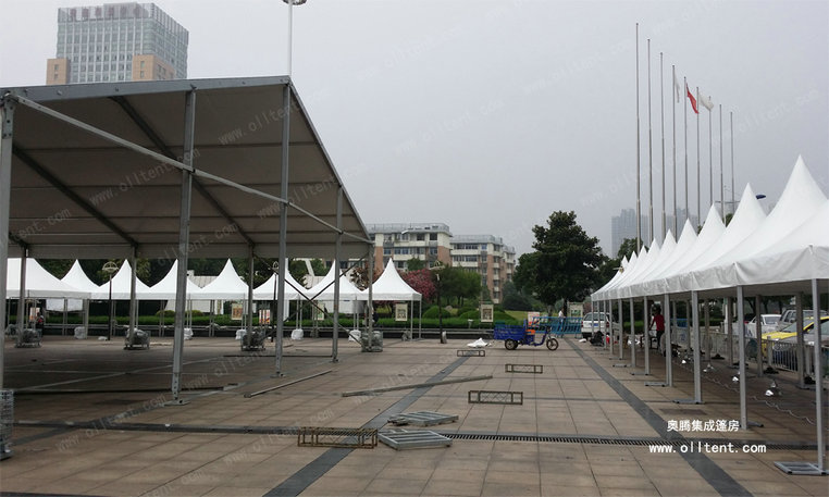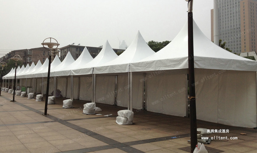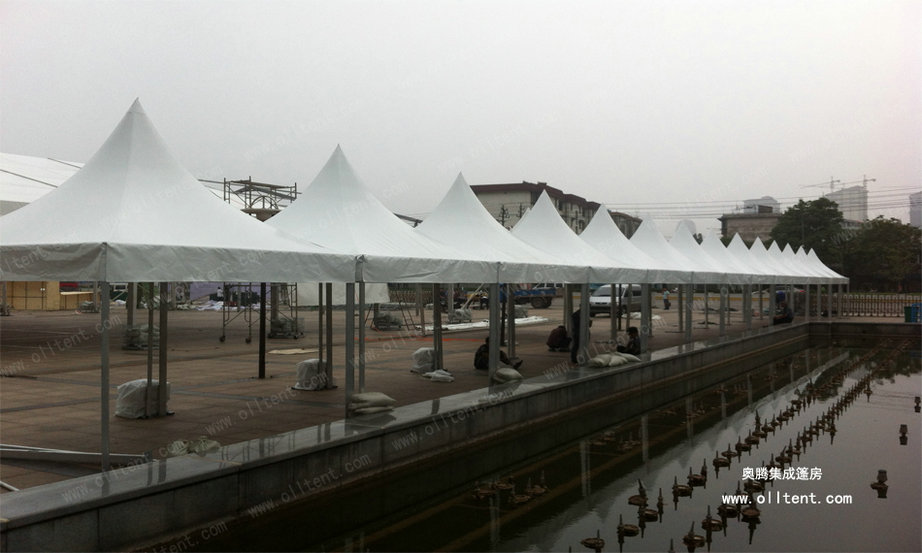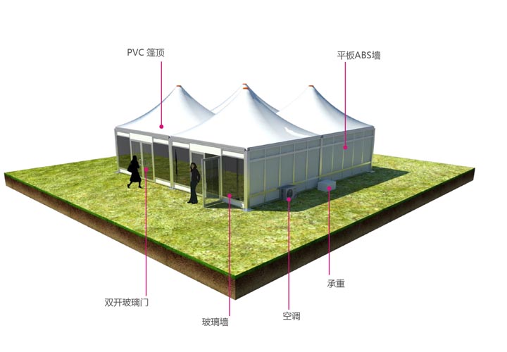 尖頂篷房優(yōu)雅,堅固,潮流,搭建工期短,易于組裝和拆卸。新錐頂篷固定方式,已獲得設(shè)計專利證書,新的固定方式,不但大大減少了組裝時間,很好的防止滑出。無需大型機械協(xié)助,單個也可用排水槽連接起來組成更大的面積,形成特殊的造型。