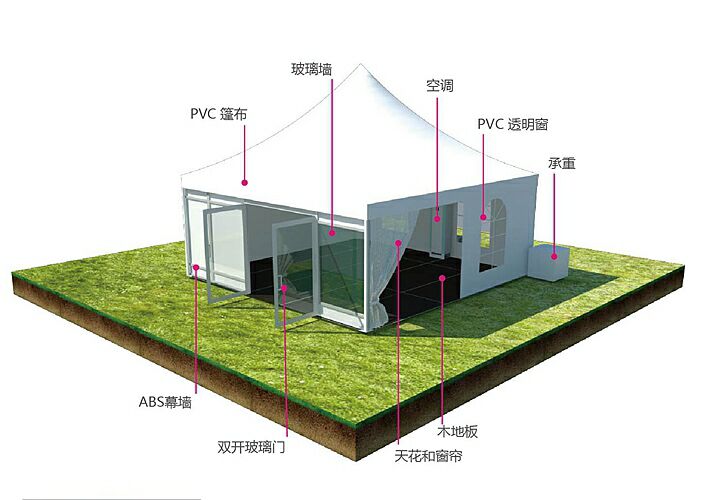 尖頂帳篷有多種可供選購的配置,例如:玻璃墻體、玻璃門、木地板、地錨釘和天花內(nèi)飾等。錐頂帳篷除了用單獨使用外,還可以將它用排水槽連接起來組成更大的面積,形成獨特的造形,在戶外活動應(yīng)用中更加精彩。