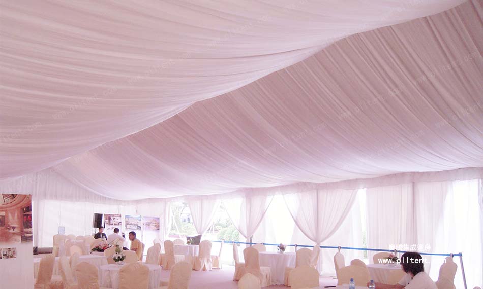 婚宴篷房采用高強度鋁合金框架,堅固耐用,雙面PVC涂層刀刮布,并有多種顏色可選用,抗風防雨,一至兩天就可搭建完一個非常大的婚宴篷房,再經過匠人們的精心裝飾,很快就會成為一座豪華的非常溫馨的婚禮殿堂。